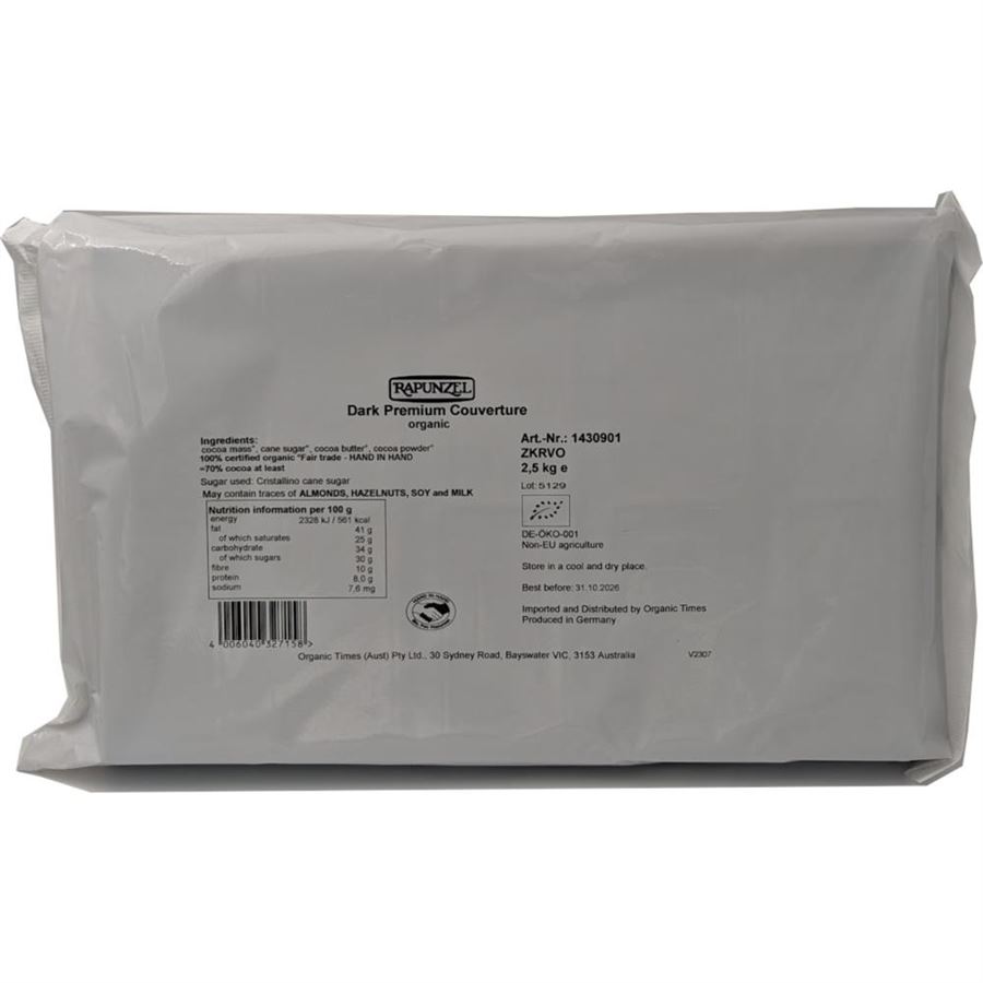 Organic Times 70% Dark Couverture Chocolate is essentially chocolate liquor to which more cocoa butter is added, with a small amount of sugar, vanilla and lecithin. It is the high proportion of cocoa solids that give dark couverture it’s seductively rich, intense and somewhat earthy chocolate flavours. With no milk additives, this is as pure & unadulterated as chocolate gets.