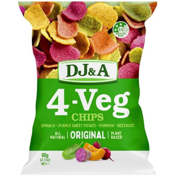 DJ&A 4-Veg Chips Original are made from a colourful mix of spinach, purple sweet potato, pumpkin & beetroot, offering a delicious crunch in every bite. All natural. Plant based. No added MSG.